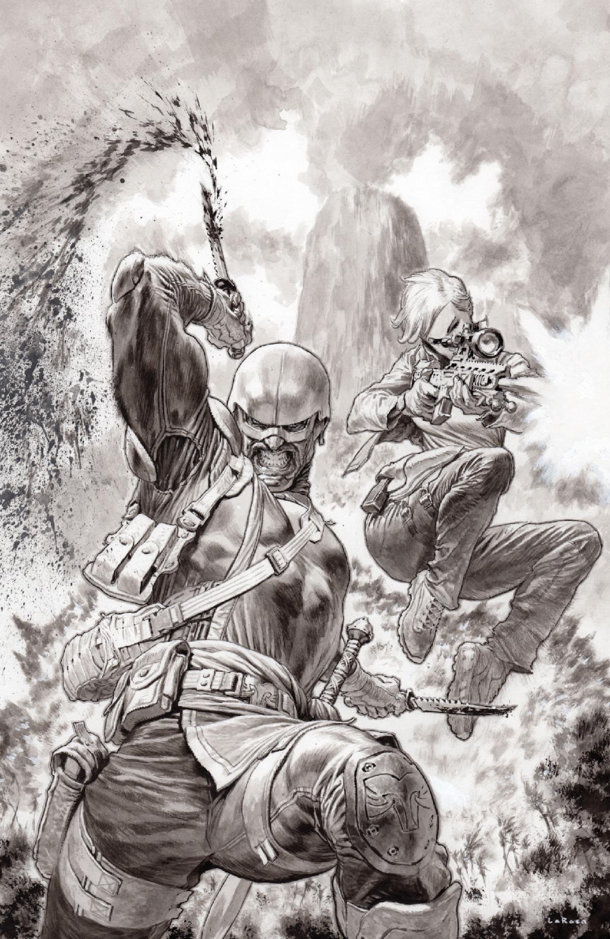 Beginning with FORT PSYCHO #1 (of 12) – hitting stands everywhere in August – LaRosa will join series co-creator and interior artist Brian Hurtt on ongoing shelf covers for the shrapnel-laden, nerve-tightening action epic that will soon unravel the many secrets and betrayals of a team of disgraced secret agents … and the truth about the classified island prison where they have been sent to atone for their innumerable crimes. LaRosa’s raw black-and-white artwork will additionally be made available as additional, incentive covers from FORT PSYCHO #1 onward through the series’ long-planned, closely held conclusion.