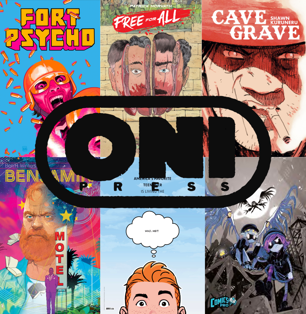 2025 saw the release of a deluge of fantastic creator-owned comics for Oni Press— including Ben H. Winter’s (EC’s Cruel Universe, The Last Policeman Trilogy) and Leomacs’ (EC’s Epitaphs from the Abyss, DC Black Label’s Rogues) BENJAMIN, a mesmerizing existential daydream about a long-dead sci-fi writer who suddenly comes back to life; Patrick Horvath’s (Beneath the Trees Where Nobody Sees) FREE FOR ALL, a gory dystopian graphic novella that skewers capitalism and billionaires (literally!); and Shawn Kuruneru’s (The Goddamn Tragedy) CAVE GRAVE, which features two startling stories of double-crossing desperation and hopeless humanity set against a backdrop of the lawless Wild West. All three titles will be available with signed bookplates at ComicsPro.