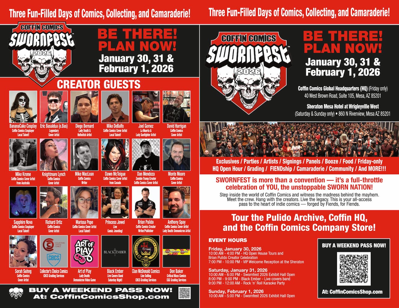 On Friday, January 30, the gates of Coffin Comics swing wide once again! Take a self-guided tour through the hallowed halls of the Coffin Compound — the beating heart of the Sworn Nation! Step inside the Coffin Comics Company Store, marvel at the Pulido Archive, raise a toast at The Coffin Bar, and walk the sacred ground of our conference room where legends are made.