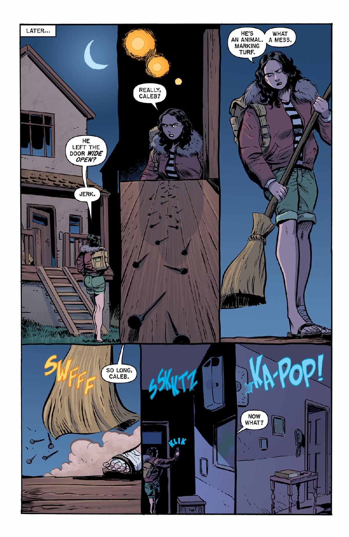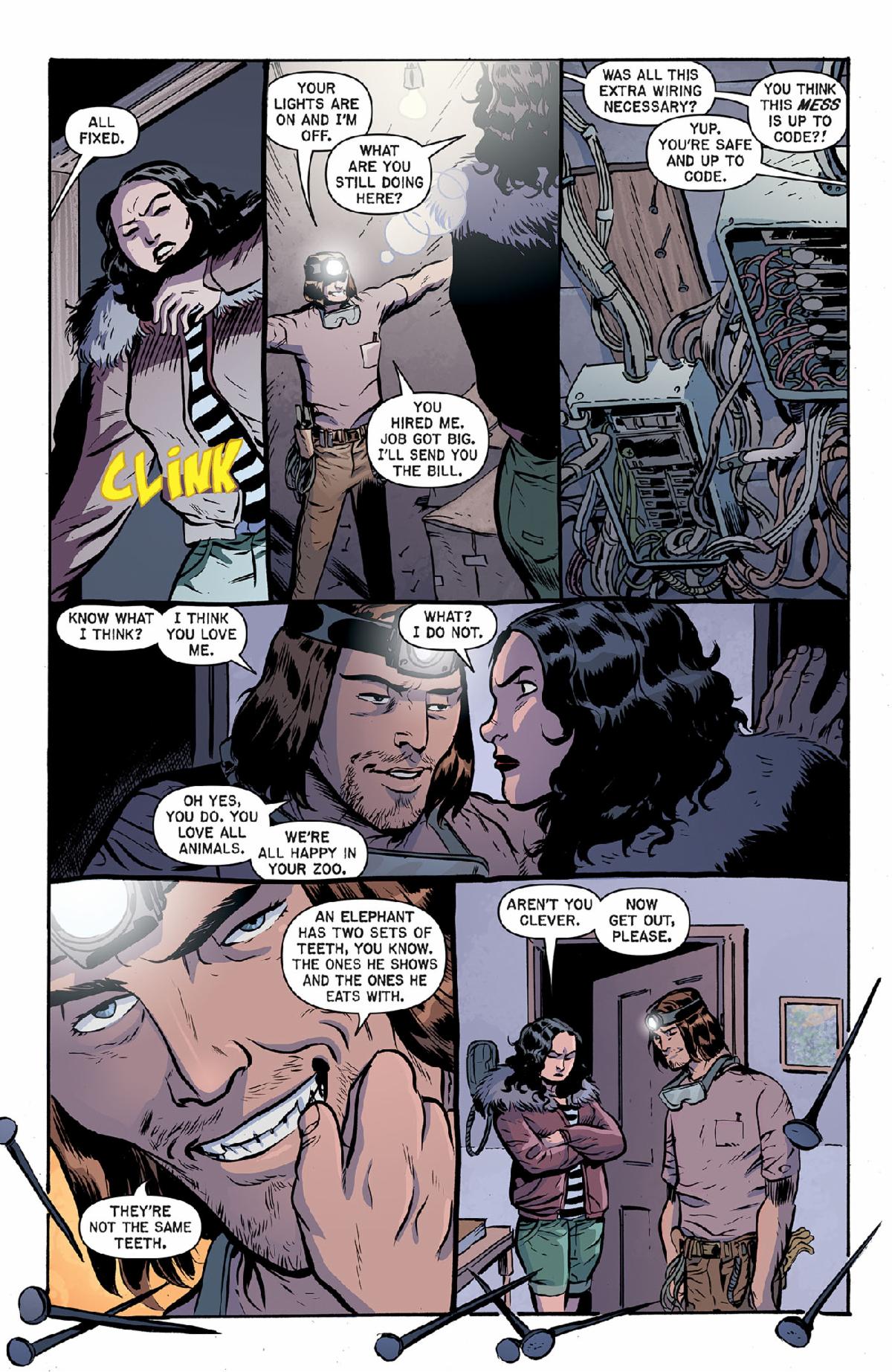 “This tale is inspired by a true story about a guy who stalked female comic creators back in the days before stalker laws,” explains Ann Nocenti. “it was up to us to defend ourselves! One visual riff in the story was a scattering of loose nails, and Dan masterfully wove the spiky motif throughout the story to terrifying effect… dare I say he nailed it? Telling EC tales for Oni Press is a blast. My modus operandi is to think about what I’m afraid of, and with so much to fear in the world, the possibilities are endless. It’s a pleasure to work with editors Allyson Gronowitz and Jung Hu Lee, who always offer tweaks to make the stories just a bit bloody better.”