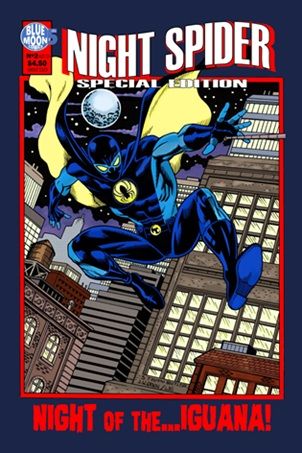 Lloyd: Night Spider is my version of Batman mixed with Spider-Man, Moon Knight, Daredevil, Nighthawk, The Spirit, Dick Tracy, Joe Friday, and the Lone Ranger. He’s more than meets the eye. He’s our creature of the night hero who handles street-level crime and criminals. I created him back in 1976, and though he’s gone through at least a half-dozen name changes, he’s always been that mix, and he’s always been Denny Knight.