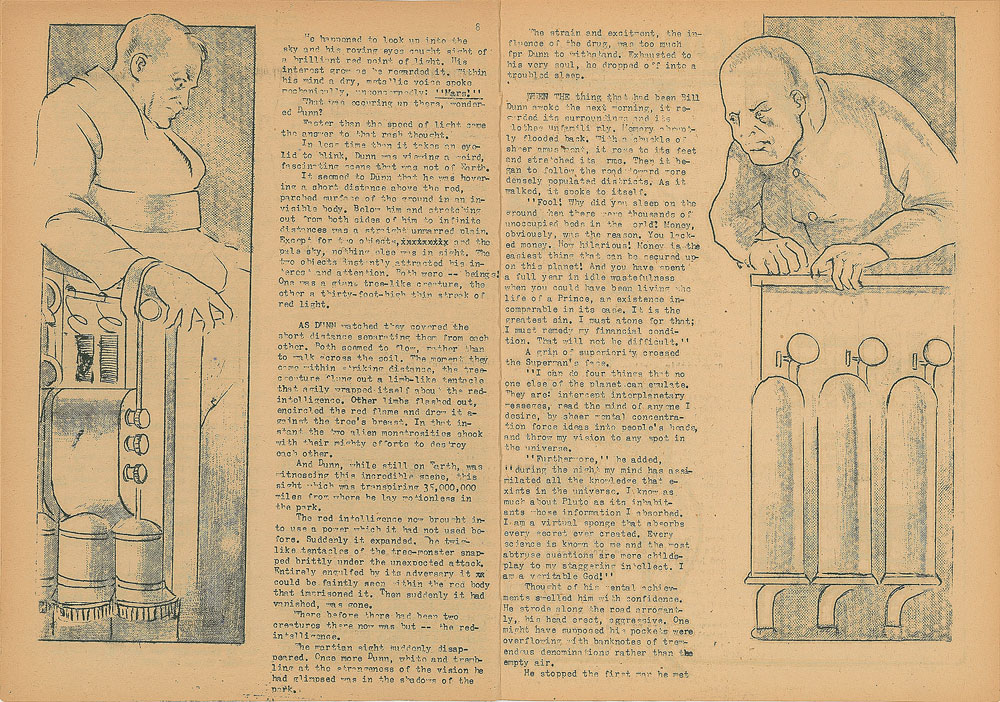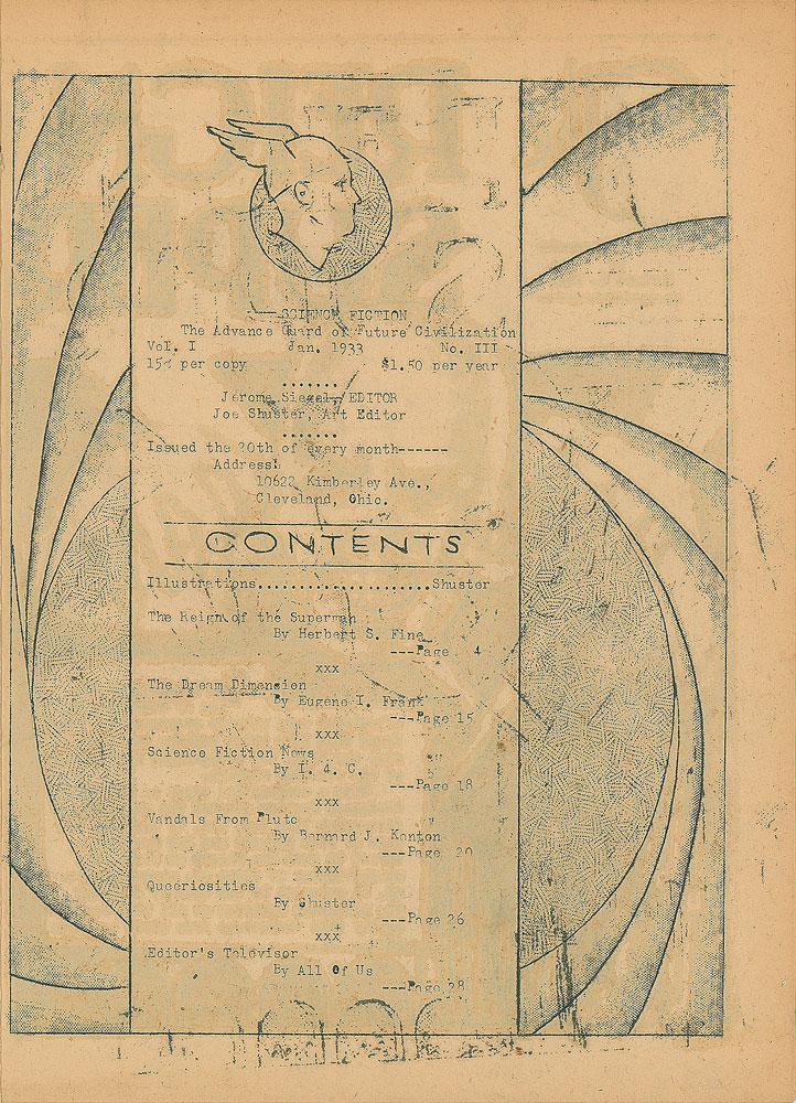 Issue No. 3 consists of 22 pages, stapled, with missing front cover, the last two pages detached, and page 19 printed upside-down. The contents of the issue: The Reign of the Superman by Herbert S. Fine (pgs. 4-14, with tremendous illustrations by Shuster); About Amelia Reynolds Long by by legendary future sci-fi writer and agent Forrest J. Ackerman (pg. 14); The Dream Dimension [Part 3 of 3] by Eugene I. Frank (pgs. 15-18); and Science Fiction News, with last page listing books sold at the Smith Book Company in Lawrence, Massachusetts (pgs. 18-19). The opening contents page lists “Jerome Siegel” as editor and “Joe Shuster” as art editor and illustrator.