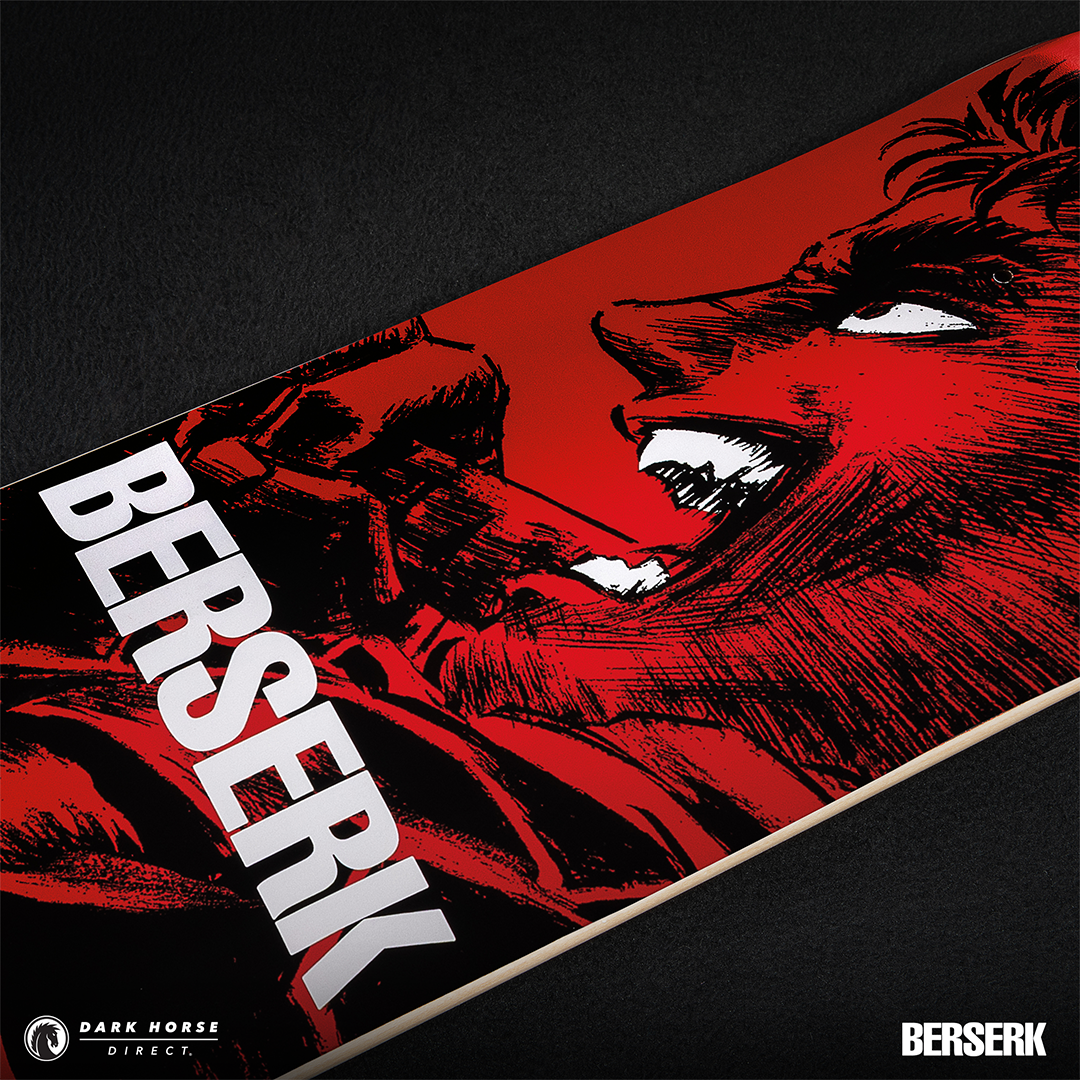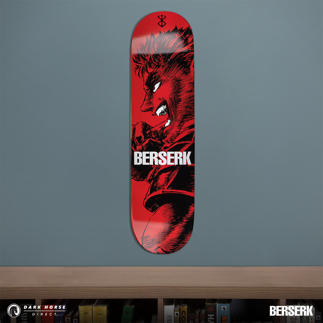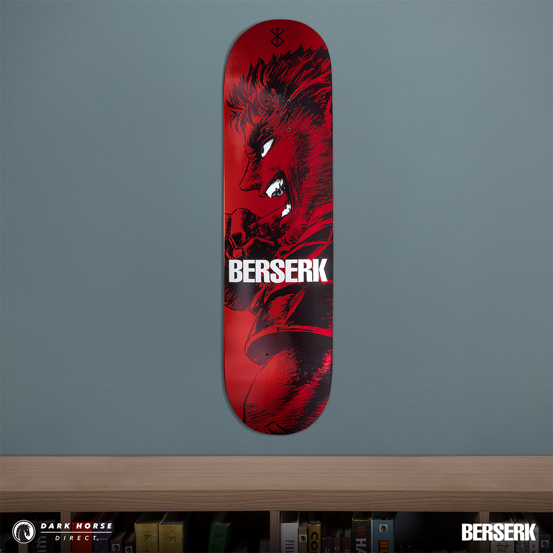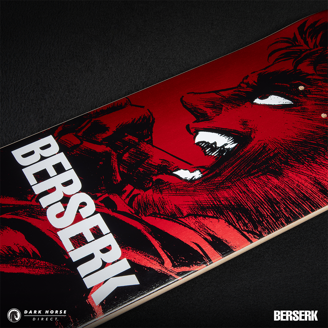 MILWAUKIE, Ore., (January 22, 2025)— Dark Horse proudly presents the Berserk Skate Deck Guts’ Rage in both a standard and foil print variant. Available via pre-order exclusively through Dark Horse Direct, these decks are inspired by a single page panel from volume 7 by the legendary Kentaro Miura. These skate decks bring Guts to life as he leads the Hawks and charges headfirst into the final clash at the Battle of Doldrey, a century-long struggle. The standard version offers a sharp red background, while the foil variant provides a crimson red metallic foil finish. The iconic Brand of Sacrifice can be found in black at the top and Berserk is in bold white lettering across the middle.