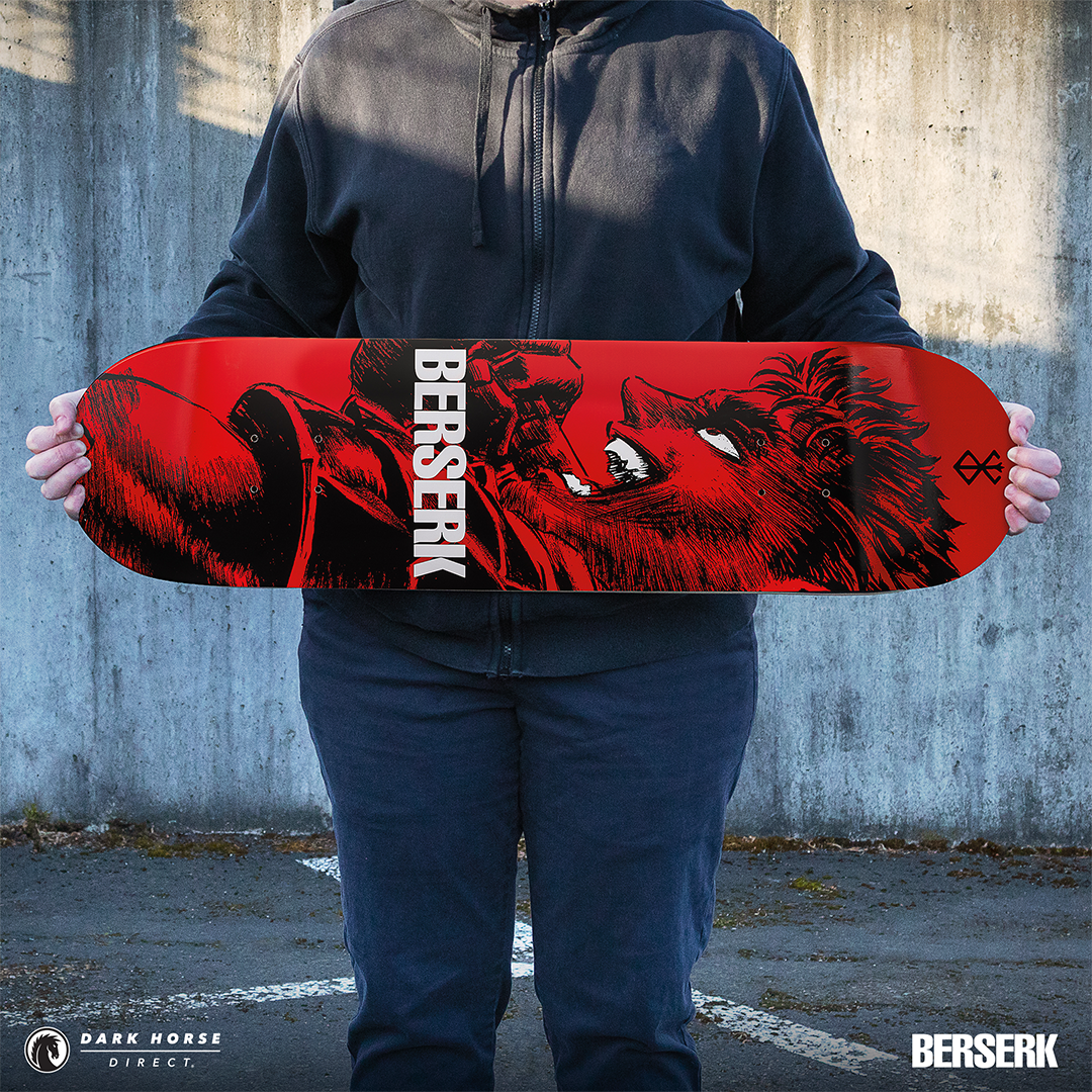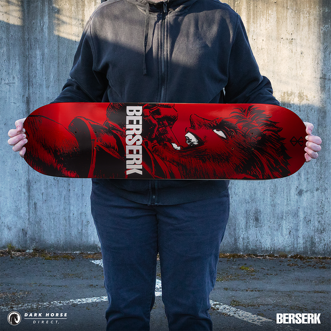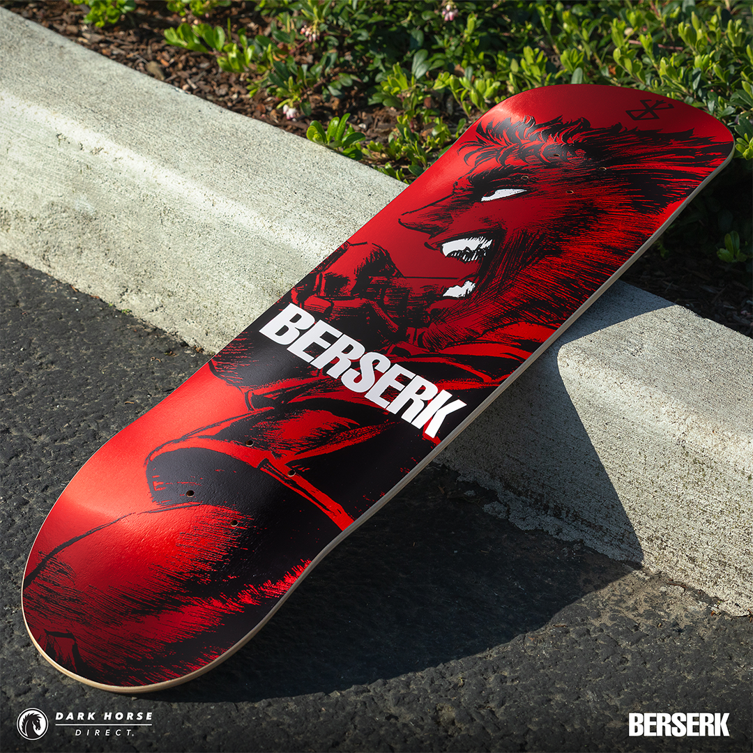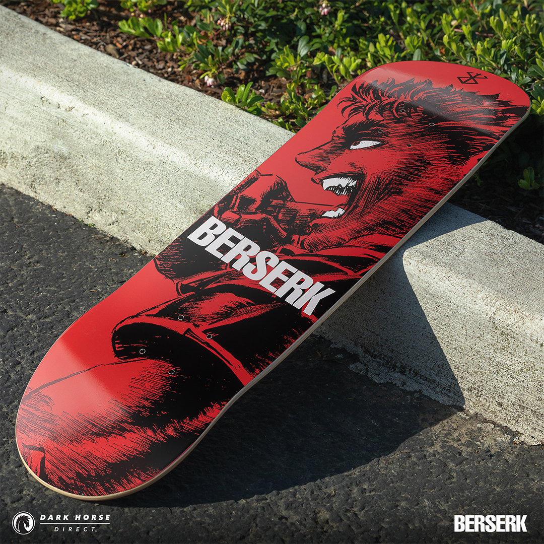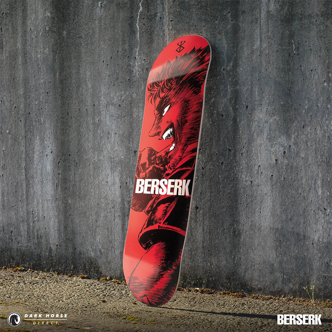 MILWAUKIE, Ore., (January 22, 2025)— Dark Horse proudly presents the Berserk Skate Deck Guts’ Rage in both a standard and foil print variant. Available via pre-order exclusively through Dark Horse Direct, these decks are inspired by a single page panel from volume 7 by the legendary Kentaro Miura. These skate decks bring Guts to life as he leads the Hawks and charges headfirst into the final clash at the Battle of Doldrey, a century-long struggle. The standard version offers a sharp red background, while the foil variant provides a crimson red metallic foil finish. The iconic Brand of Sacrifice can be found in black at the top and Berserk is in bold white lettering across the middle.